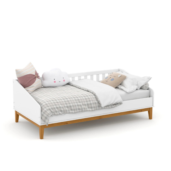 Com um design clean e delicado, beleza e funcionalidade. O contraste do branco com detalhes em madeira traz charme e leveza ao quarto do bebê. Ideal para acomodar visitas ou servir como um sofá aconchegante, ela é uma peça versátil que continua útil mesmo após o crescimento da criança.